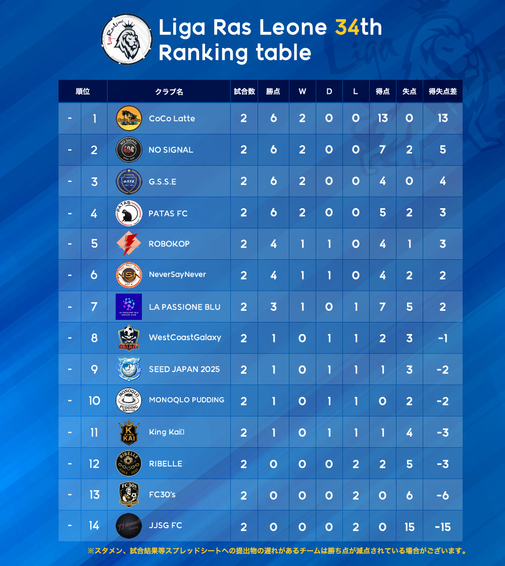 2025.12.6(Sat)第1・2節試合結果及び順位表。